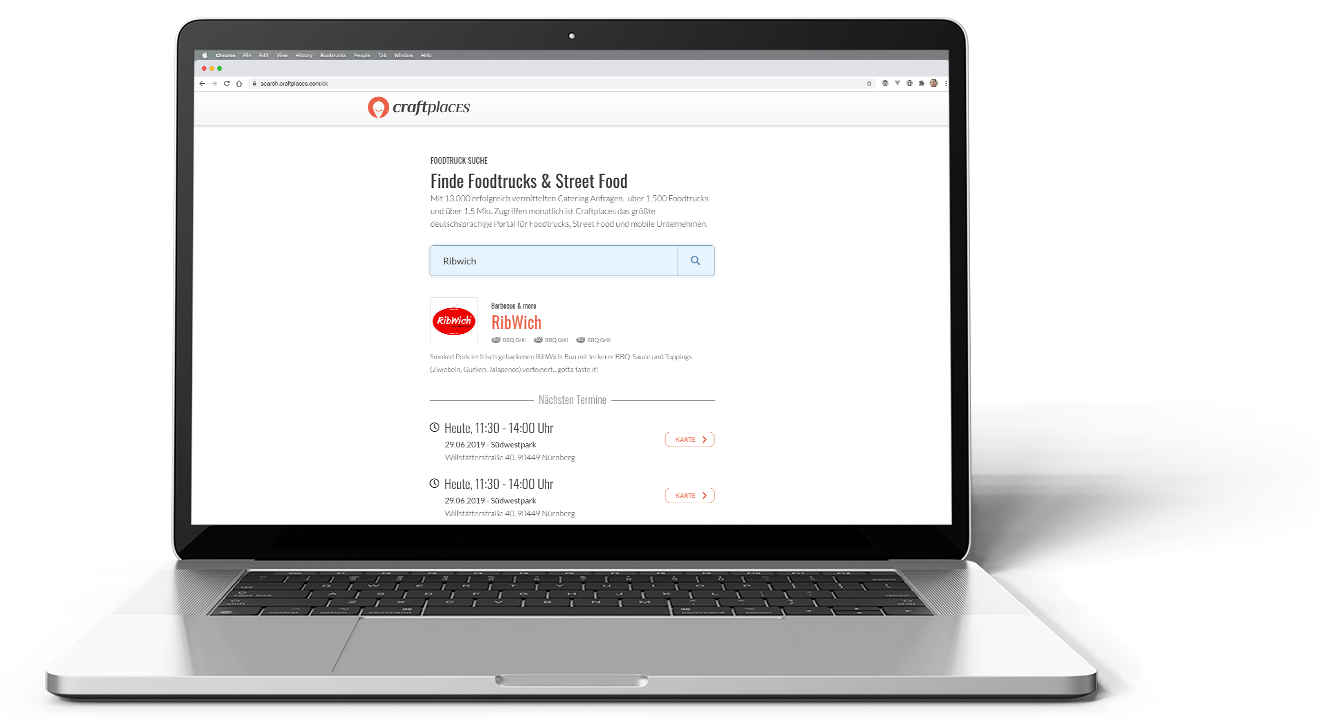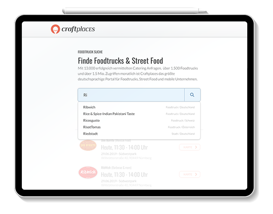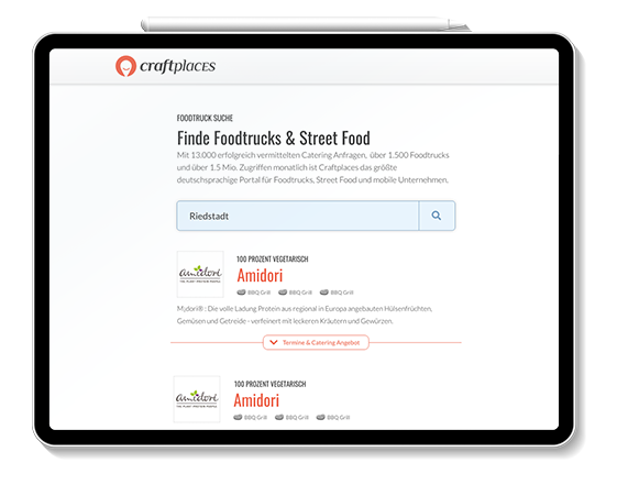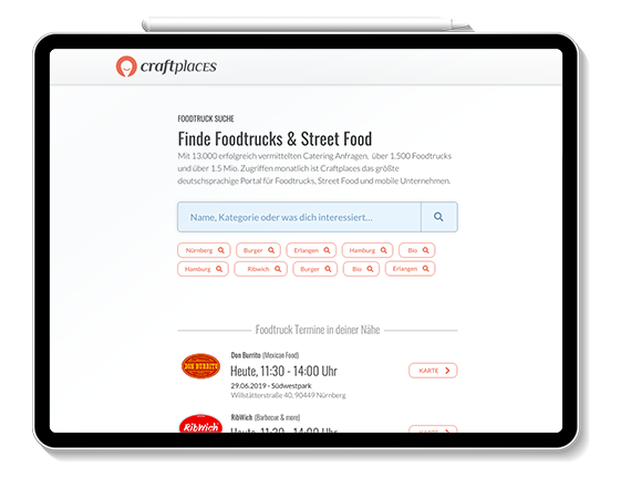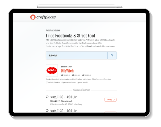 Compared to the Craftplaces Map, Craftplaces Search is more a research application to get access to all Craftplaces Connect functionalities. As a full text search engine for food trucks all searches can be filtered by categories and date. There are different results depending on if the food truck is active and on the road or only hireable for catering. Deep links to Craftplaces Map are provided for every date.